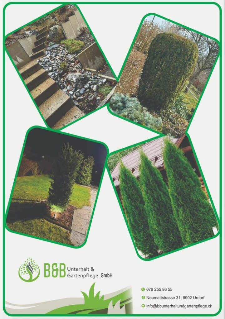 Bei B&B Unterhalt & Gartenpflege verbinden wir Fachwissen mit echter Leidenschaft fuer Natur und Handwerk. Unser Ziel ist es, jedem Garten und jedem Grundstueck die Aufmerksamkeit zu schenken, die es verdient. Ob regelmaessige Pflege, saisonale Arbeiten oder individuelle Projekte – wir arbeiten praezise, effizient und mit hohem Qualitaetsanspruch. Vertrauen Sie auf unsere Erfahrung und geniessen Sie einen gepflegten Aussenbereich, der Ihren Alltag bereichert.